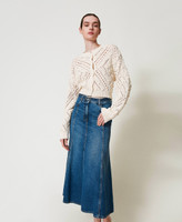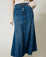 Falda vaquera de tela añil de talle alto con cinturón a juego con hebilla metálica Oval T. Presenta un cierre de cremallera y botón, bolsillos delanteros y de parche en la parte trasera, cortes verticales, línea ceñida en la cadera y acampanada hacia el bajo.