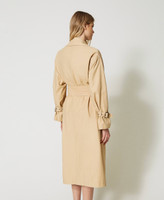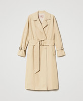 Twinset ofrece una nueva versión de la clásica gabardina con este modelo fabricado en algodón y nailon técnico con textura diagonal. Corte holgado, cuello con maxisolapas, cierre de doble botonadura con botones, mangas largas con hombros caídos y correas en la parte inferior, bolsillos ribeteados, cinturón desmontable con hebilla de aro metálico y está forrada. Elegante y contemporáneo, elevará cualquier conjunto en un instante.