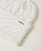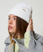 Gorro de punto de ochos con ribete acanalado y placa de latón claro con el logo.
