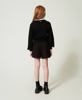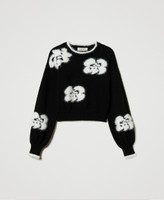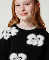 Jersey de niña confeccionado con viscosa elástica de punto raso decorado con apliques de flores de pelo, cuello redondo, manga larga holgada, bajo acanalado, placa metálica con el logo en la parte trasera y corte holgado.