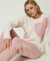 Conjunto de tejido bouclé compuesto por un jersey de manga larga con corazones grabados y un pantalón con elástico en la cintura.