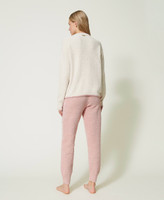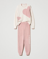 Todo un concentrado de romanticismo, este conjunto de punto con un ligero efecto bouclé está compuesto por una sudadera de cuello redondo con corazones grabados, manga larga y acabados acanalados y por un pantalón con elástico insertado en la cintura y bajo acanalado estrecho. Para looks desenfadados e icónicos.