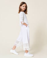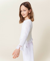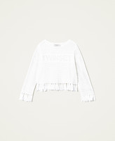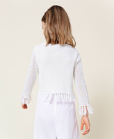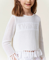 Jersey de crochet de algodón mixto perforado con logotipo en el centro, puños y bajo con flecos y forro de punto satinado.