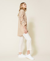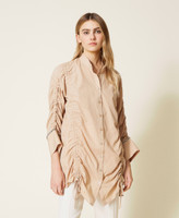 Juego de fruncidos gracias a los cordones de ajuste y cordones en el pecho y en las mangas para esta maxicamisa de algodón de rayas jacquard, con cuello alto mao, cierre con botones, puños muy altos decorados con un bordado de engastes y abrochados con tres botones con el logotipo, canesú y fuelle en la parte trasera. Dará un toque chic a tus looks en un día caluroso en la ciudad.