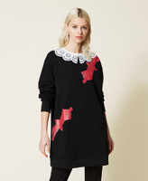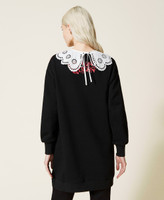 La maxisudadera con estampado de la colección cápsula Twin Queen con cuello redondo, vivos acanalados y mangas largas puede transformarse en un minivestido. Se combina con el cuello desmontable de algodón de encaje suizo festoneado que se ata al cuello con lacitos.