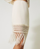 Minifalda de felpa con elástico en la cintura, cierre de cremallera, pasamanería bordada con flecos en el bajo y corte ajustado.