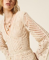 Mono corto de algodón con elaboración de ganchillo y forro de muselina de algodón en tono a juego. Presenta un escote de pico pronunciado, manga larga redonda acampanada en la parte inferior, cierre con botón y ojal en la parte trasera, logotipo de corazón metálico en la parte trasera, cinturón extraíble de cuerda retorcida con terminales metálicos y corte ajustado.