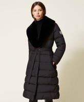 Plumífero largo de tejido ultraligero de textura mate con cuello de pelo sintético desmontable y forrado.
