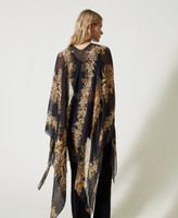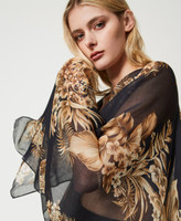 Poncho-fular de tela con estampado de flores tropicales y placa con el logotipo en la parte posterior.