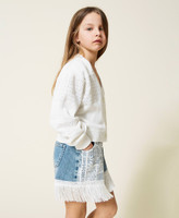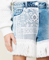 Shorts vaqueros con lavado a la piedra, inserción de encaje y pasamanería con flecos en el bajo, con cinco bolsillos.