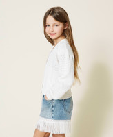 El lado romántico del denim queda plasmado a la perfección en estos shorts vaqueros de niña con inserción de encaje y pasamanería con flecos en el bajo. Presenta un corte recto, cierre con cremallera y botón, cinco bolsillos y lavado a la piedra. Solo hay que añadir un top y unas sandalias y el look estará completo.