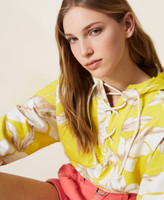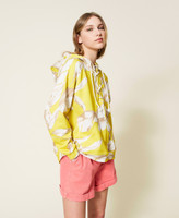 La sudadera de algodón made in Italy con estampado de flores de hibisco, un diseño exclusivo de Twinset, es una prenda sencilla con un toque de moda. Tiene corte ancho, cuello con capucha y abertura en la parte delantera con cordón de ajuste de algodón natural, mangas raglán largas y puños, bolsillo canguro y logotipo Oval T en la parte trasera. Un nuevo concepto de sudadera para llevar también en looks refinados.