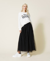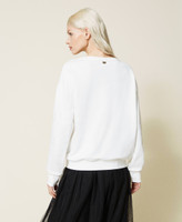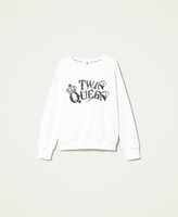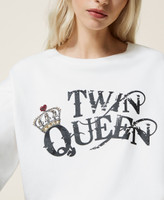 El estampado se embellece con una aplicación de strass en la corona en la sudadera de cuello redondo de la colección cápsula Twin Queen en mezcla de algodón, con hombros caídos, mangas largas, vivos acanalados y placa con el logotipo en la parte trasera. Elevará con estilo todos los looks informales.