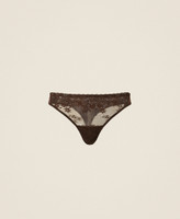 Tanga de encaje festoneado con motivo floral, parte trasera y laterales de charmeuse de microfibra, lazo de organza y logotipo de corazón de metal en el centro trasero.