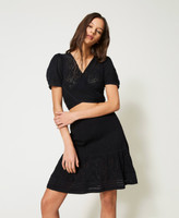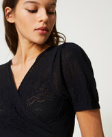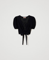 ¿Bolero o top para llevar sobre la piel? Interpreta como quieras este modelo sin costuras made in Italy de punto de mezcla de viscosa con flores caladas por toda la prenda. Escote de pico, mangas fruncidas, cintas para atar en la cintura cruzadas en forma de lazo en la parte delantera, placa con logotipo Oval T en la parte trasera. Combínalo con los pantalones o con la falda de tubo a juego.