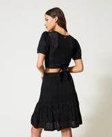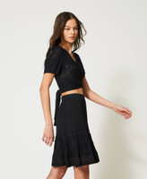 Top bolero sin costuras de punto en mezcla de viscosa con flores caladas en toda la prenda, cierre con cintas en la cintura.