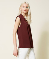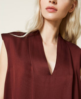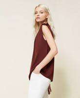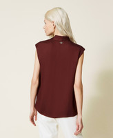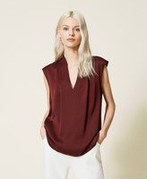 Top en envers satén con mangas casquillo, escote de pico con pinzas en los hombros y logotipo en la parte trasera.