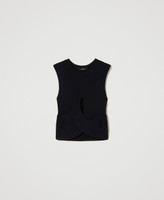 Detalles de moda. Top recortado de canalé ancho en mezcla de viscosa con diseño cruzado ceñido, abertura delante y detrás, sin mangas, placa del logotipo en la espalda. Un comodín del vestuario para los looks a capas o como protagonista.