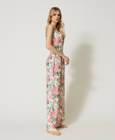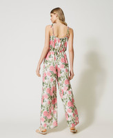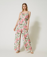 Mono de georgette crespón con estampado de rosas, tirantes para atar como lazo, elástico en la cintura y pantalones palazzo.