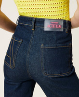Urban must-have. Vaqueros confeccionados en denim rinse azul oscuro de talle medio, pernera recta y acanalado en el centro, cremallera metálica en la parte delantera y pespunte con el logotipo en la parte trasera.