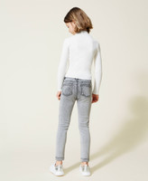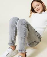 Encanto urban-chic a la medida de tu hija con este pantalón vaquero pitillo con tratamiento a la piedra desteñido, lettering con strass termoadhesivo, cierre con cremallera y botón automático y pespuntes de color negro en contraste. Ideales para un sinfín de looks, en el cole o en el tiempo libre.