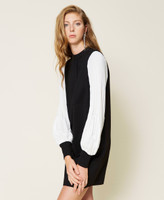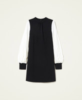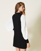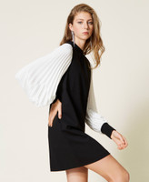Vestido corto de punto Milano elástico ligero con manga larga de crepé plisado, cuello redondo y cremallera en la parte trasera.