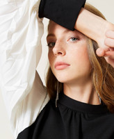 El little black dress se renueva en este vestido corto de punto Milano elástico ligero con manga larga de crepé plisado con puños en contraste. Presenta un corte recto, cuello redondo y cierre con cremallera y logotipo Oval T en la parte trasera. Esencial y sofisticado, perfecto en looks 24 horas.
