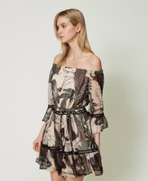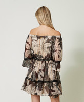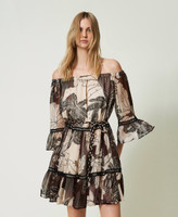 Vestido corto de crespón georgette con estampado de flores exóticas, escote sin hombros con elástico, volantes con bordado à jour.