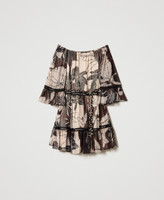 Un refinado y gráfico vestido corto de crespón georgette con un estampado exclusivo de Twinset, confeccionado con volantes rematados con ribetes à jour en contraste. Tiene una línea suave, un escote barco que también se puede llevar fuera del hombro con elástico, mangas raglán de tres cuartos con volante en el bajo, forro y una placa con el logotipo en forma de corazón en la espalda. Puedes definirla en la cintura con el cinturón trenzado extraíble con encaje tricolor y bolas doradas. Con sandalias planas o tacones altos en función de la ocasión.