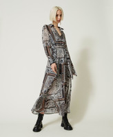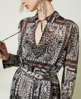 Vestido largo de la colección Actitude de crespón con lúrex y estampado de fular, cuello camisero, aberturas en el bajo y combinación a juego.