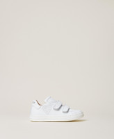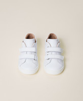 Zapatillas de piel con corazón perforado lateral, cierre de velcro, logotipo en la parte trasera y suela de goma.