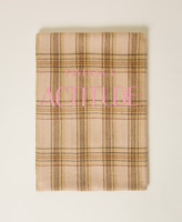 Suave e intemporal. Bufanda con elaboración de jacquard de cuadros teñido en hilo con estampado del logotipo Actitude engomado en contraste con la parte inferior y vivos deshilachados.