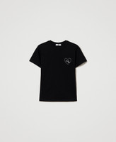 Camiseta de corte estándar de punto de algodón con estampado de corazón y logotipo, cuello redondo rematado con canalé y manga corta.