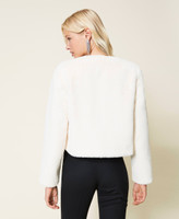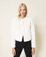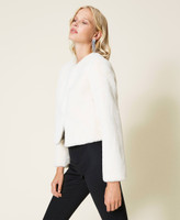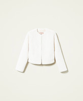 Chaqueta con cuello mao de tejido de fibra larga de tacto suave, cierre con corchetes y está forrada.