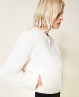Cuando bajan las temperaturas, no te encuentres desprevenida con la chaqueta con cuello mao de tejido de fibra larga, tacto suave, cierre con corchetes, bolsillos insertados en los laterales y está forrada. El complemento ideal del minivestido de encaje y botines de piel.