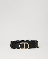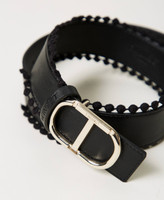Cinturón de efecto piel con cintura estándar, hebilla con logotipo Oval T, regulación con gemelo y pasamanería con pompones de tela.