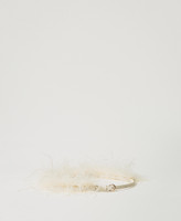 Cinturón de talle regular con plumas colocadas en el aplique de tela, cierre de hebilla y Oval T de metal dorado claro.