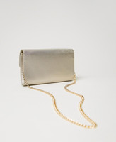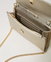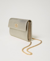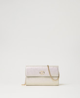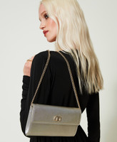 Bolso de mano «Glossy» efecto piel laminada con grano saffiano, cierre con solapa, compartimentos internos para tarjetas, asa bandolera de cadena extraíble.