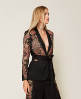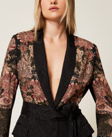 Blazer en tissu jacquard avec motif de rose et imprimé floral placé, une exclusivité Twinset. Il présente un col à revers, une fermeture boutonnée droite, des manches longues, des poches passepoilées avec rabat, une doublure, une ceinture assortie amovible et une coupe droite. Parfait pour les fêtes et les cérémonies.