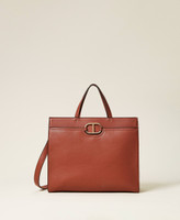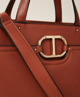 Cabas a effet cuir de veau, avec poche plate frontale, logo Oval T en métal et bandoulière amovible.