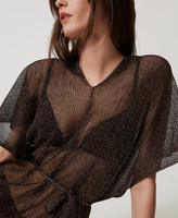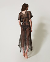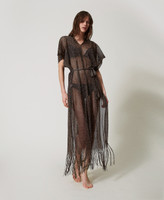 Caftan long en filet avec fil de lurex, franges dans le bas, manches courtes et ceinture coordonnée, coupe fluide.