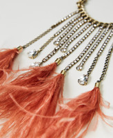 Collier en laiton vieilli avec chaînes en strass et plumes, fermoir à mousqueton réglable.