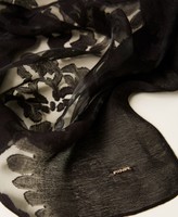 Étole en dentelle incrustée avec transparences et étiquette siglée.