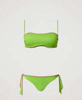 Bikini en tissu lurex rehaussé d’une broderie en fil contrasté et composé d’un haut de maillot bandeau ampliforme, avec bonnets amovibles, et d’un slip brésilien doté de lacets.