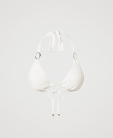 Haut de maillot de bain triangle en tissu jacquard avec motif de feuilles et de fleurs, et anneaux dorés à la forme irrégulière. Ampliforme, il présente des bonnets amovibles, des lacets à nouer autour du cou ou à porter comme bretelles grâce aux boutonnières présentes aux extrémités, et une fermeture dotée de fins lacets dans le dos avec anneaux dorés dans le bas.