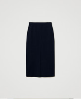 Jupe mi-longue en tissu rayé avec fil lurex, fermeture éclair sur le côté, poches italiennes, fente superposée sur le devant, étiquette siglée Oval T à l’arrière, doublure et coupe droite.