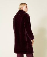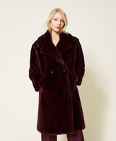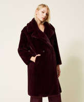 Manteau en tissu à fibre longue avec revers, poches latérales, boutonnière croisée et doublure.