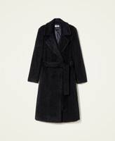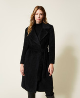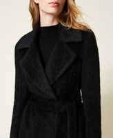 Manteau croisé en drap brossé avec revers, poches à rabat, boutons-pression, ceinture assortie.