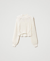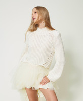 Une coupe fluide pour le maxi pull col montant en fil de laine mélangée avec finition côte perlée, bas asymétrique court sur le devant et plus long sur les côtés, motif diagonal et ajouré dans le bas. Une touche informelle et féminine pour toutes les tenues.