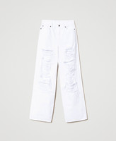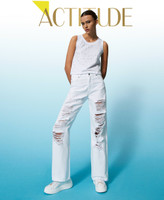 Un charme à la fois brut et chic pour le pantalon ample en bull de coton avec accrocs localisés sur les jambes, fermeture éclair et bouton, cinq poches. Avec des baskets ou des bottines pour des looks urbains et actuels.